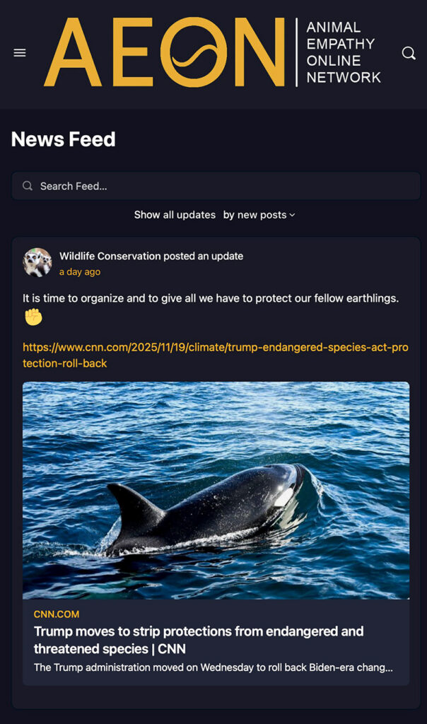 AEON is built to strengthen the Animal Empathy movement by giving people accurate information, community support, and a place to collaborate on solutions. It combines education, news, and social interaction into one platform that helps amplify efforts to protect animals and improve the systems that affect them.